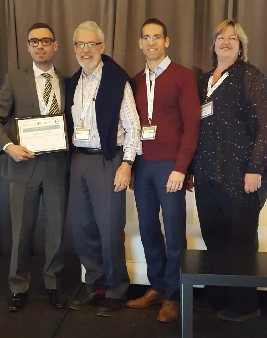 Le troisième projet qui a reçu une subvention du partenariat est celui du département des sciences urologiques de l’Université de la Colombie-Britannique. Il a pour but d’identifier des biomarqueurs prédictifs de la réponse ou de la résistance aux thérapies ciblées et à l’immunothérapie chez les patients atteints d’un cancer du rein. Les chercheurs analysent l’ADN tumoral répandu par les cellules cancéreuses dans le système sanguin, dans le but de vérifier s’il existe une corrélation entre certaines anomalies spécifiques et la réponse au traitement. Si on découvre l’existence d’une forte corrélation, le séquençage génétique constituerait alors une méthode simple et non invasive de personnaliser le traitement des patients atteints d’un cancer du rein métastatique; les médecins pourraient alors offrir le bon médicament au bon patient, ce qui augmenterait ses chances d’en recevoir les bienfaits. Photo: Dre Lucia Nappi accepte la bourse de recherche remise par Dr Michael Jewett (Réseau canadien de recherche en cancer du rein), Dr Ilias Cagiannos (La fondation boursière de l’Association des urologues canadiens) et Christine Collins (Cancer du rein Canada). |